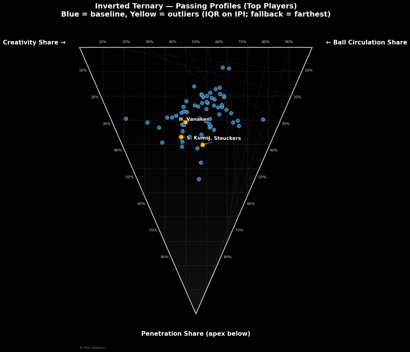 These players score the highest on the Innovative Passing Index. I want to now see how good players are compared to each other and use visuals. The first visuals I’m going to look at is a terniary plot.