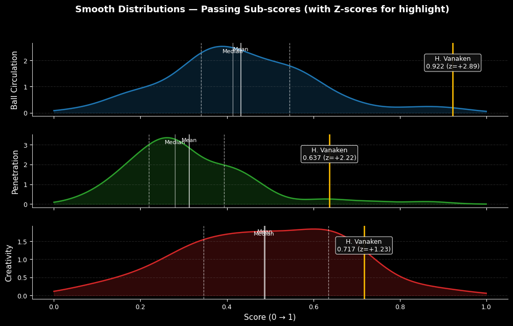 Another way of visualising how well Vanaken scores in comparison to his peers in the same position. It shows how well Vanaken is in the distribution of the scores and what the median/mean is for these scores. Based on z-scores we can also see how much Vanaken is an outlier, because of his positive z-scores.