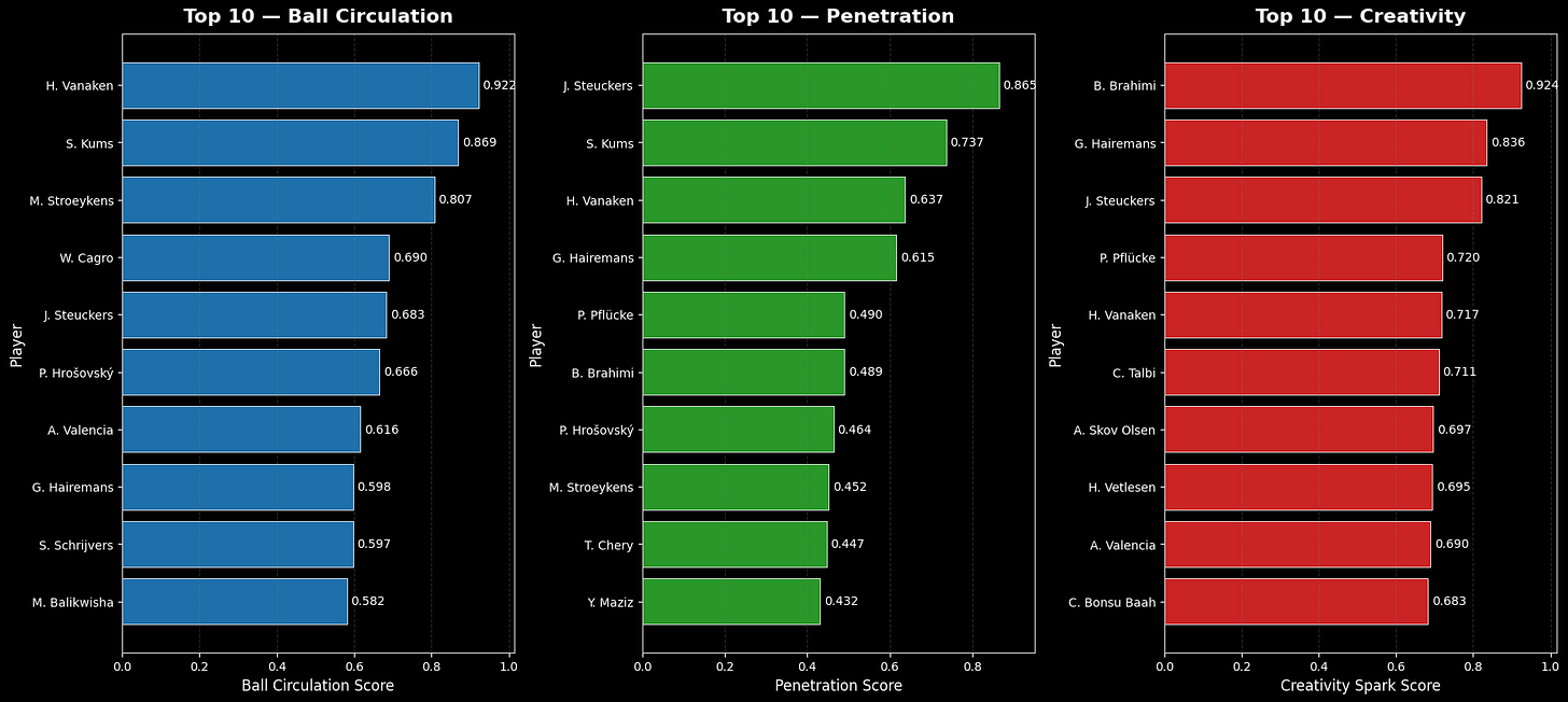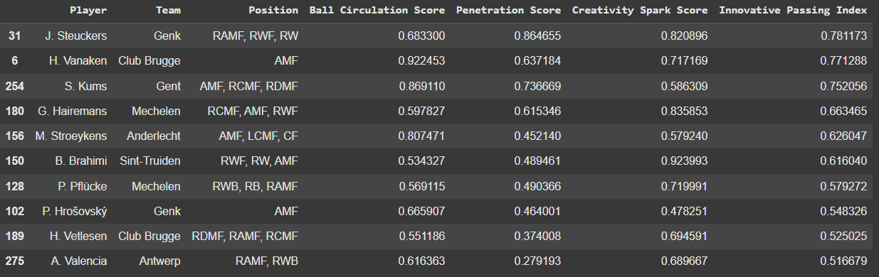 In the image above we can see which the top 10 players are in each score. This gives us an idea of the top player and whether top players also score high in other metrics. Vanaken, Kums, Stroeykens, Steuckers, Brahimi en Harremans are players to keep an eye on.
