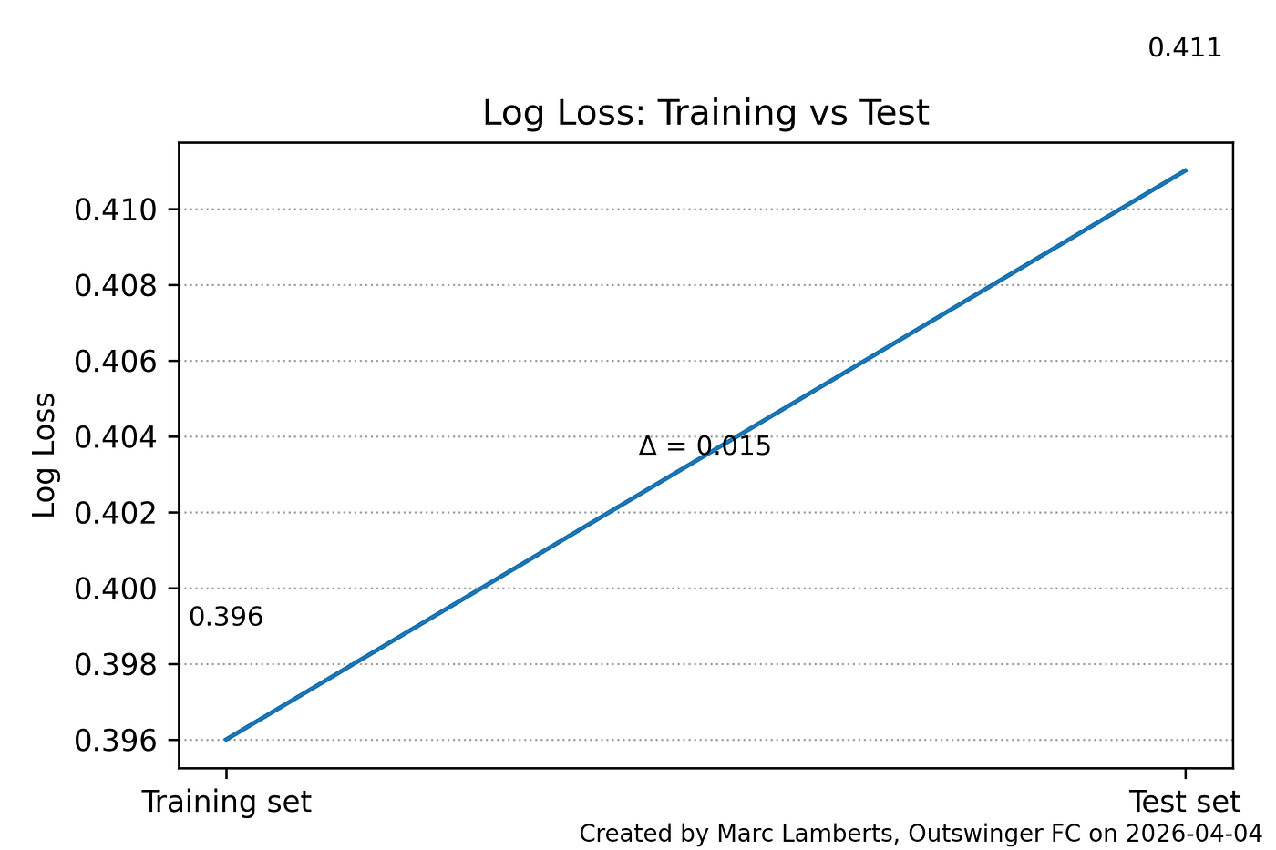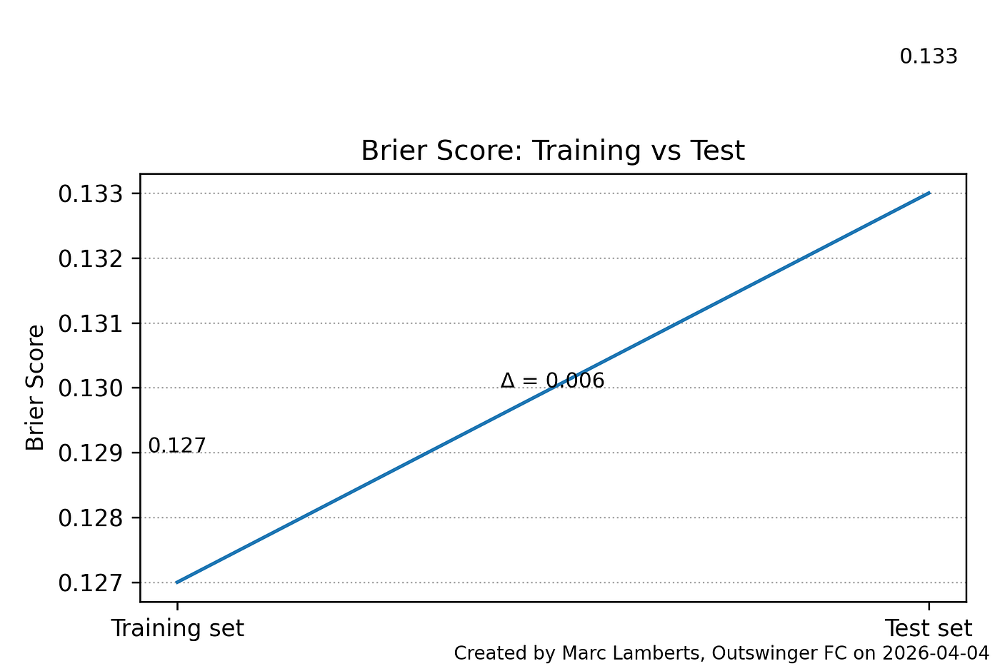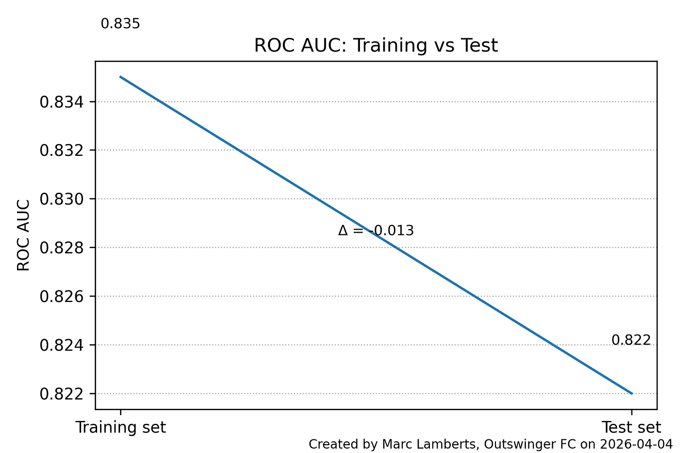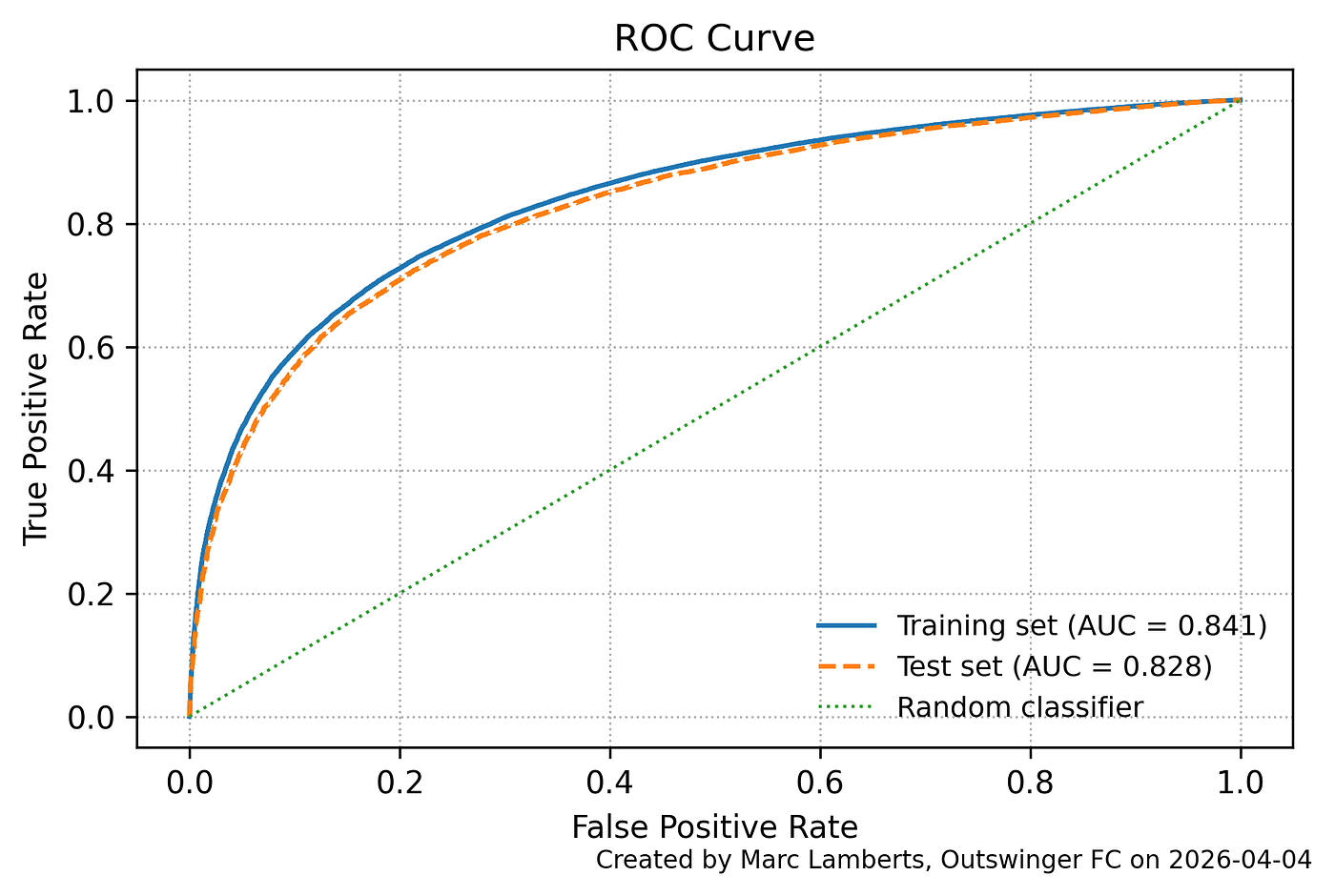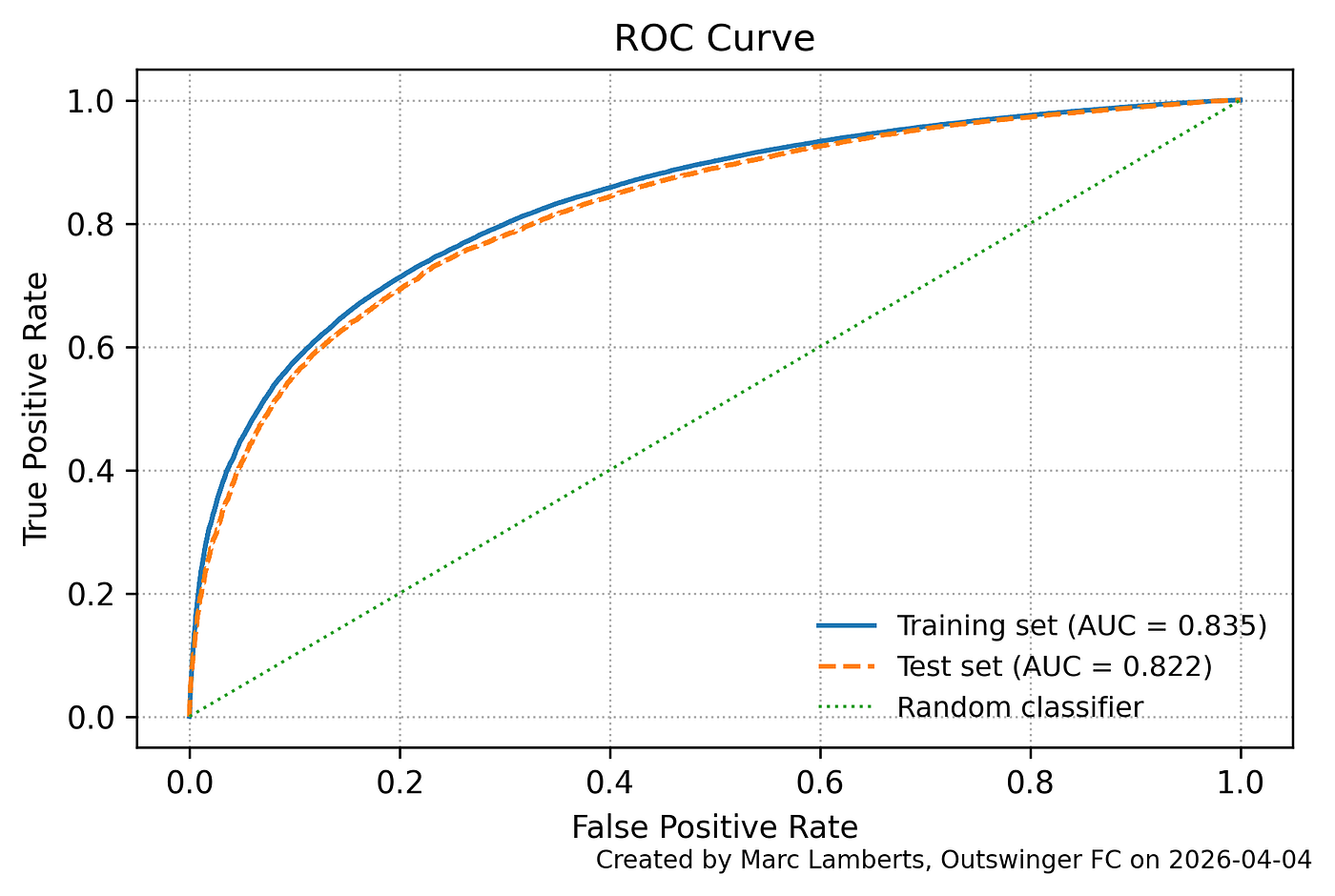 In terms of probabilistic accuracy, the model performs well. On the training set, it achieves a log loss of 0.396 and a Brier score of 0.127, both pointing to well-calibrated probability estimates. These figures hold up on the test set, where log loss rises modestly to 0.411 and the Brier score to 0.133. The limited deterioration between training and test performance is encouraging; it suggests the model is not simply memorising the training data, but has learned patterns that carry over to unseen passes.