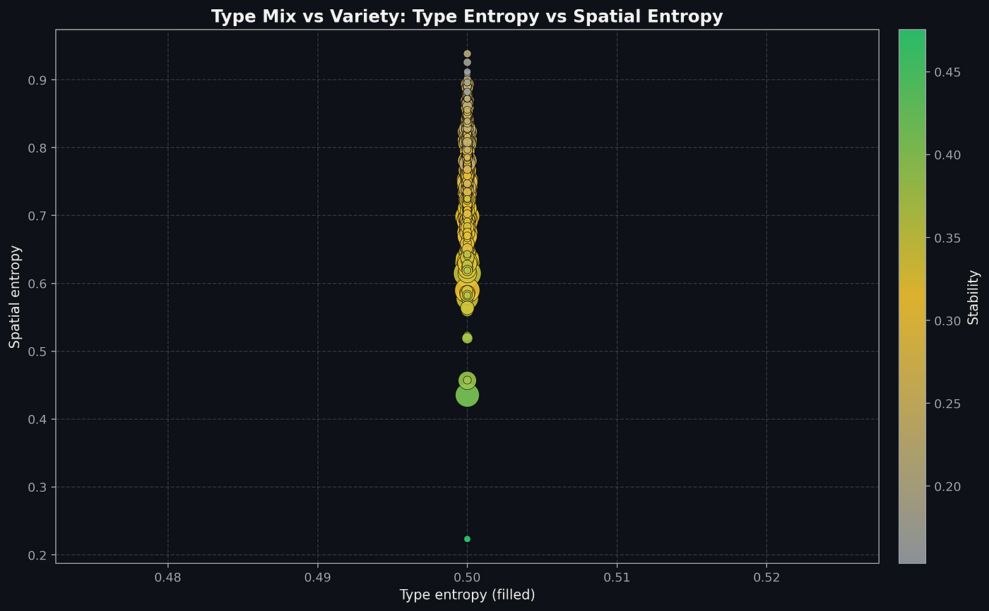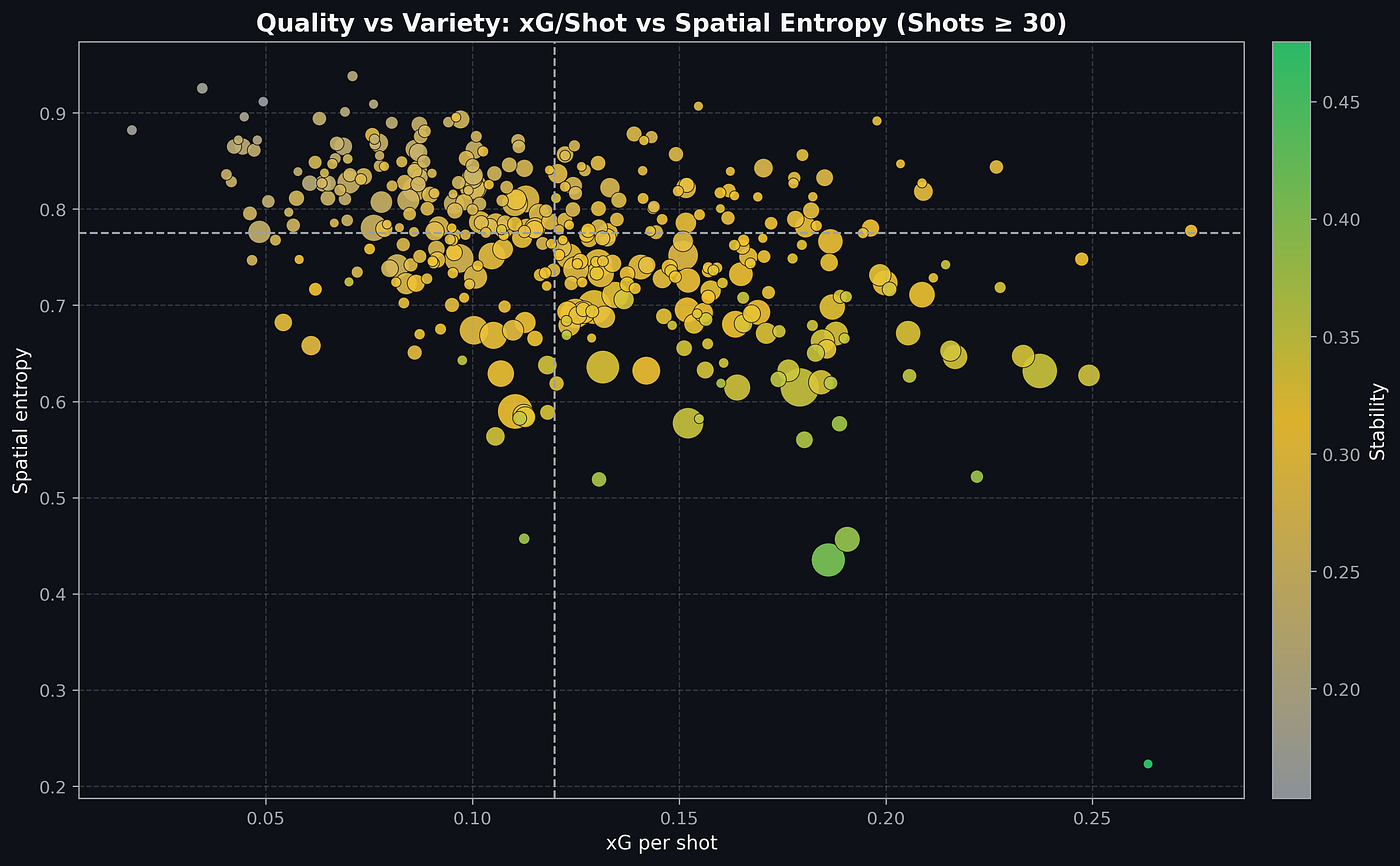 Chance quality (xG/shot) and repeatability (spatial entropy) aren’t the same thing. You can create high-quality chances in varied ways — or lower-quality chances very consistently.