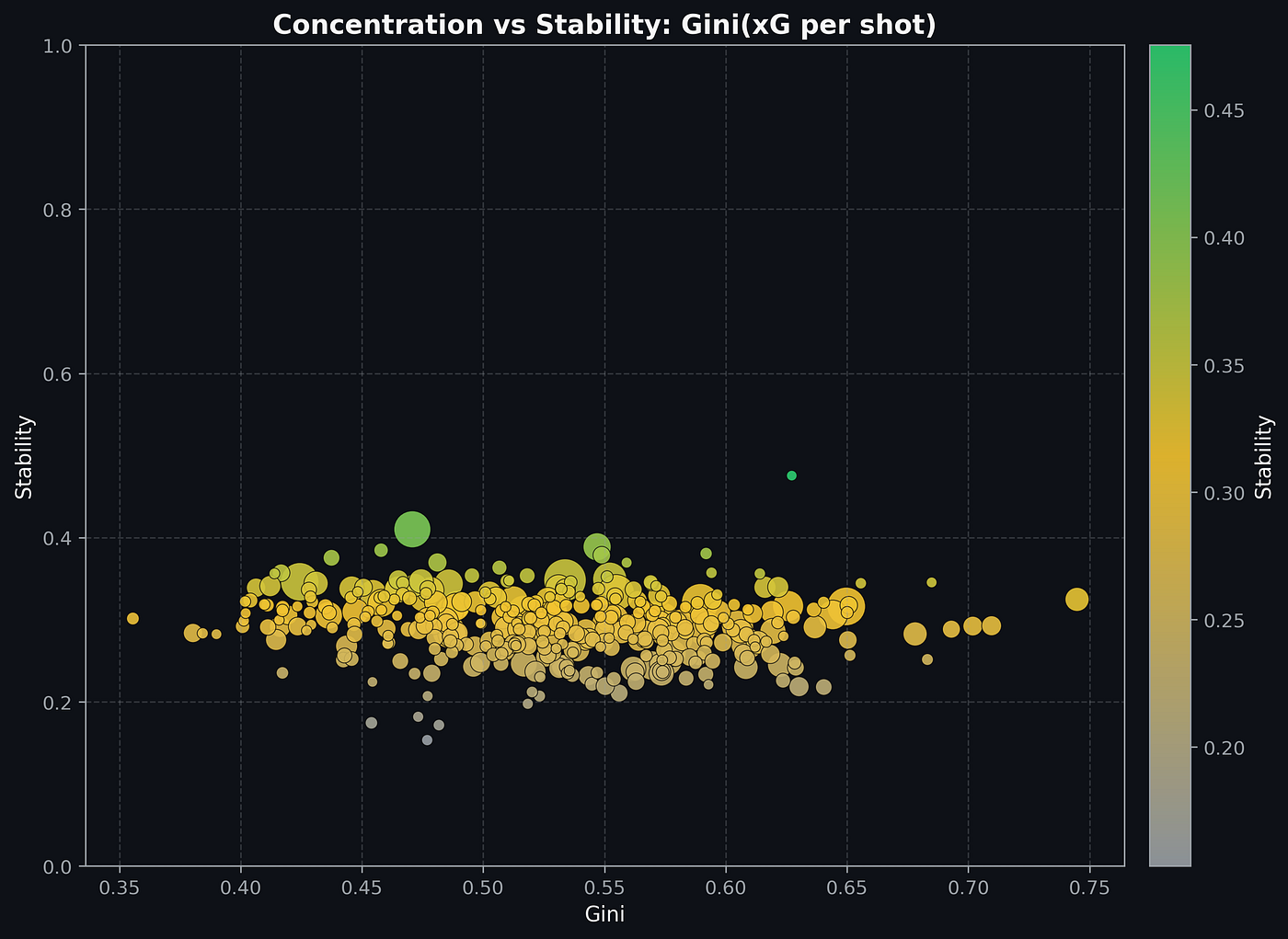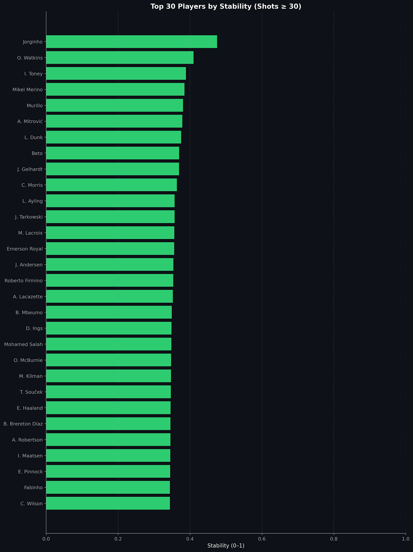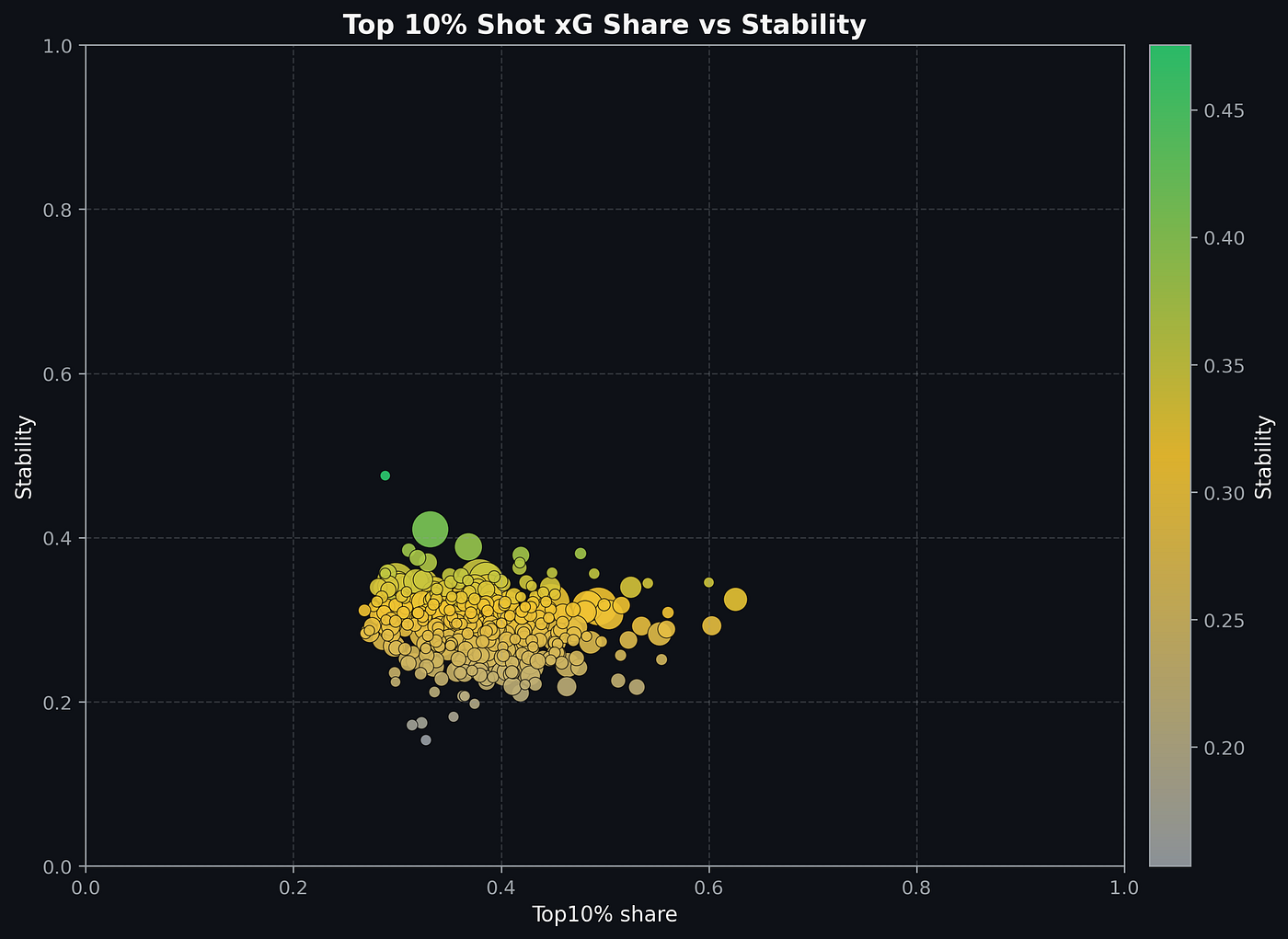 These elements are combined into a single stability score, kept on a simple 0–1 scale. Higher scores mean a player’s chances tend to come from consistent locations and situations; lower scores indicate a more scattered profile. That score is then used to weight each player’s total expected goals, producing an adjusted figure that reflects the share of their xG built on stable foundations. The result doesn’t replace traditional xG but adds another layer: separating the players who accumulate chances in a repeatable way from those whose totals depend more heavily on context, game flow, or one-off moments.
