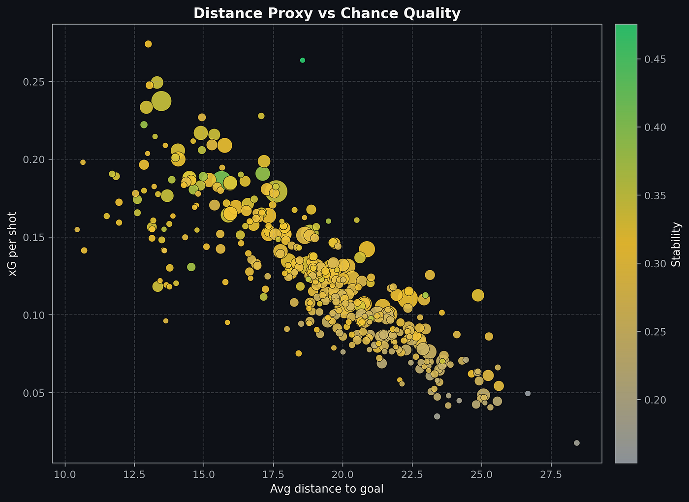 Distance is a simple proxy for shot difficulty. As average distance increases, xG/shot drops sharply.