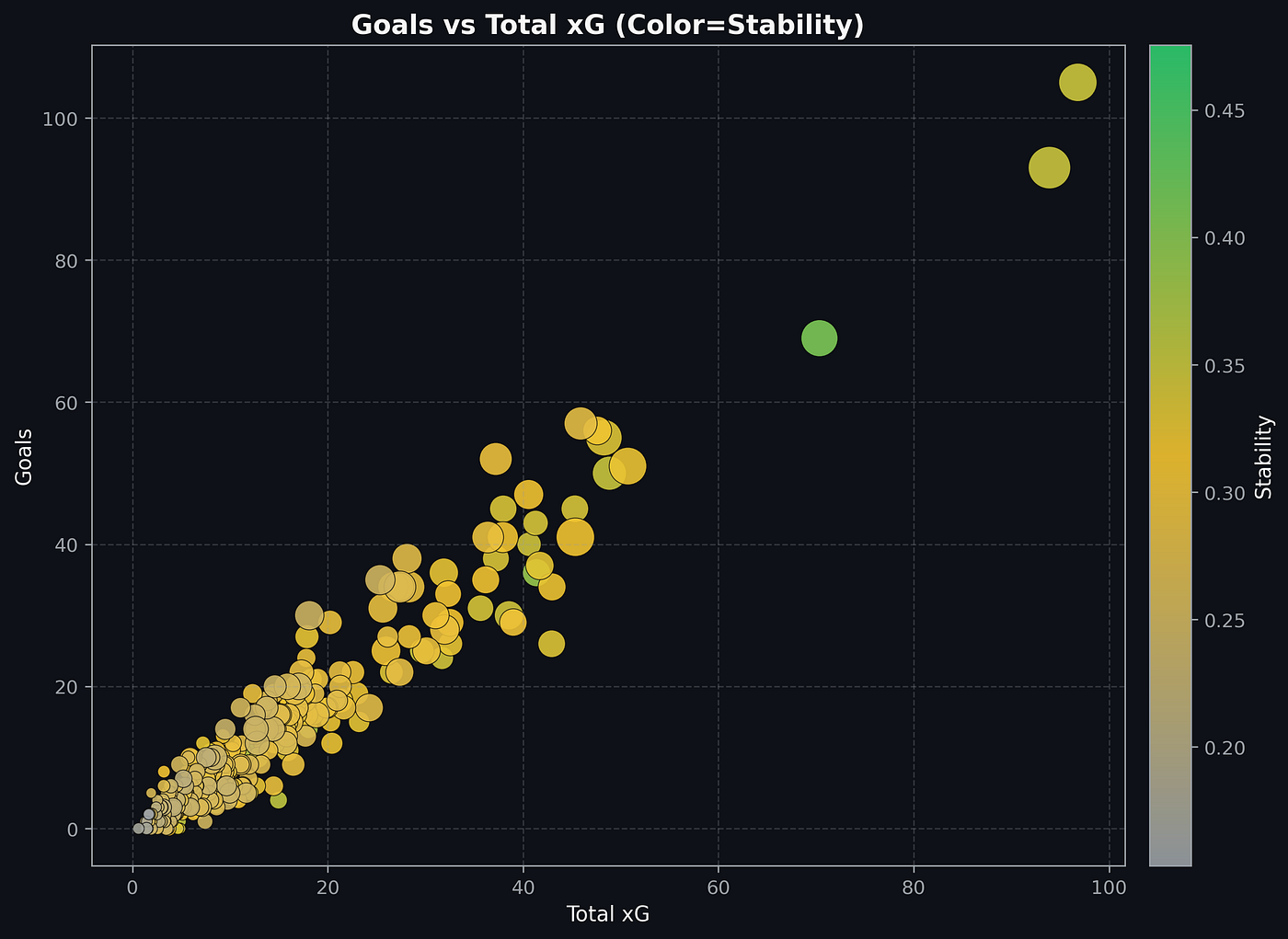 Stability describes shot profile repeatability, not finishing. Goals still scatter around xG as finishing + variance kicks in.
