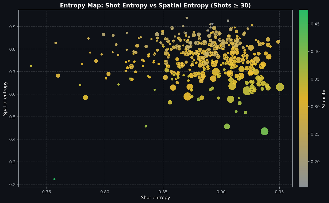 Entropy-based measures are sensitive to sample size. Players with fewer shots may appear artificially concentrated simply because their opportunity set is small, while very high-volume shooters will naturally show broader distributions.