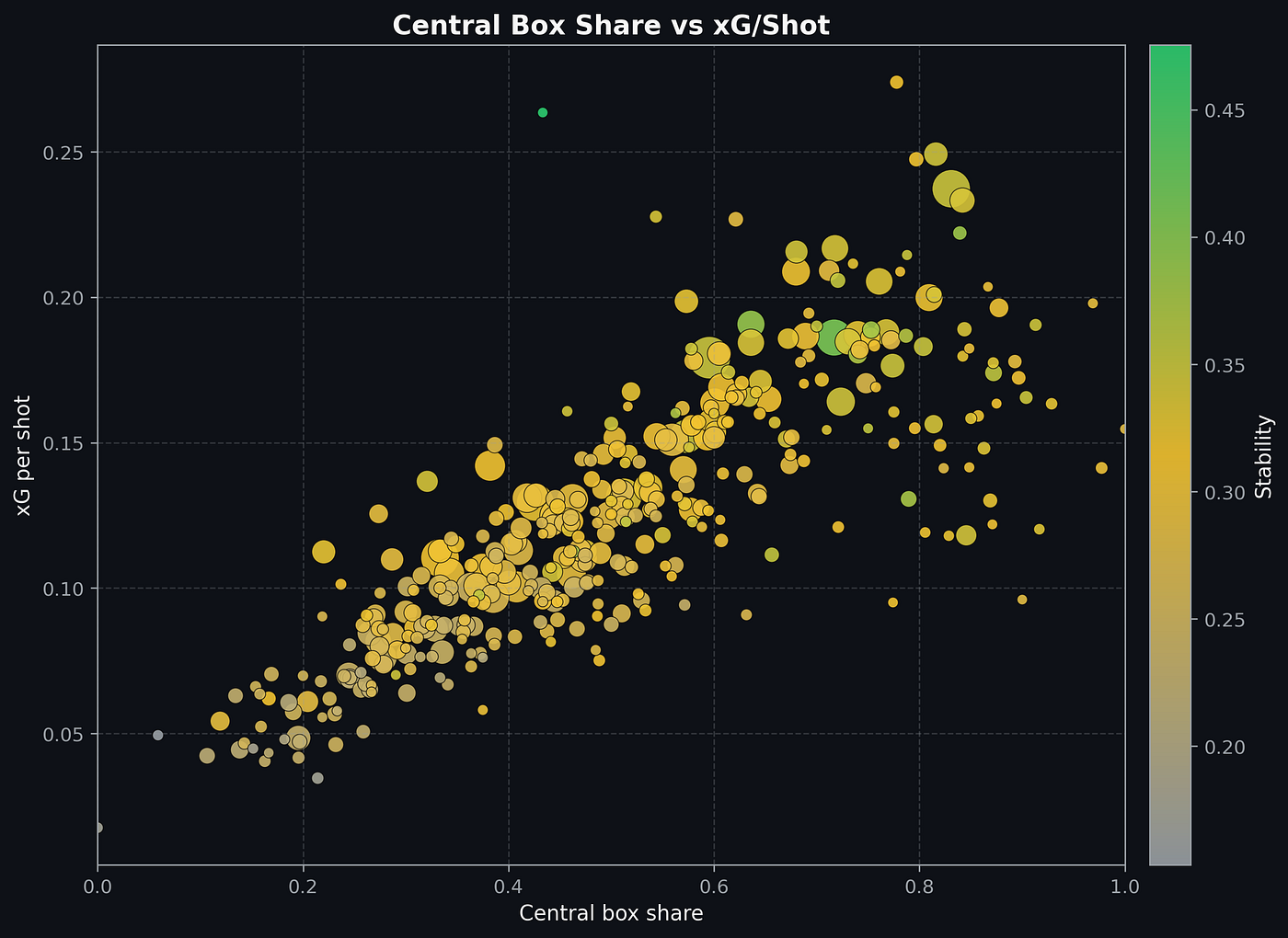 Shot stability is a simple way of describing how repeatable a player’s chances are. Two forwards can finish a season with the same expected goals total, but arrive there through very different shot profiles. One might rely on a steady stream of close-range chances from central areas, while another mixes those with speculative efforts from distance or low-probability angles. The first profile tends to be easier to reproduce over time; the second is often more dependent on game state, moments of space, or individual decisions. Stability, in this sense, is not about how good the shots are, but how consistently they come from the same kinds of situations.
