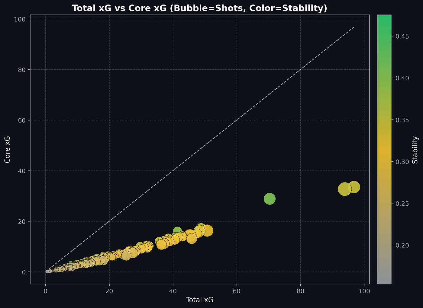 Core xG tracks total xG, but not perfectly. Players with the same total xG can have very different “core” profiles depending on stability.