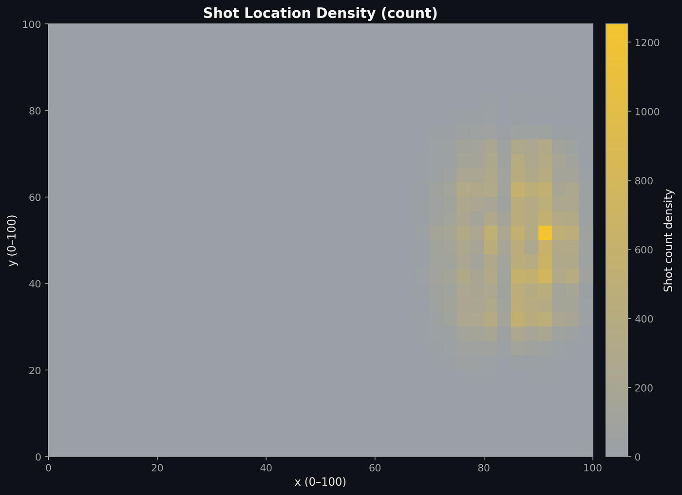 Importantly, this isn’t about whether the shots are good or bad. It’s about the consistency of location. A player who reliably arrives in the same dangerous spaces is generally easier to project forward than one whose shot locations depend heavily on match context or individual improvisation.