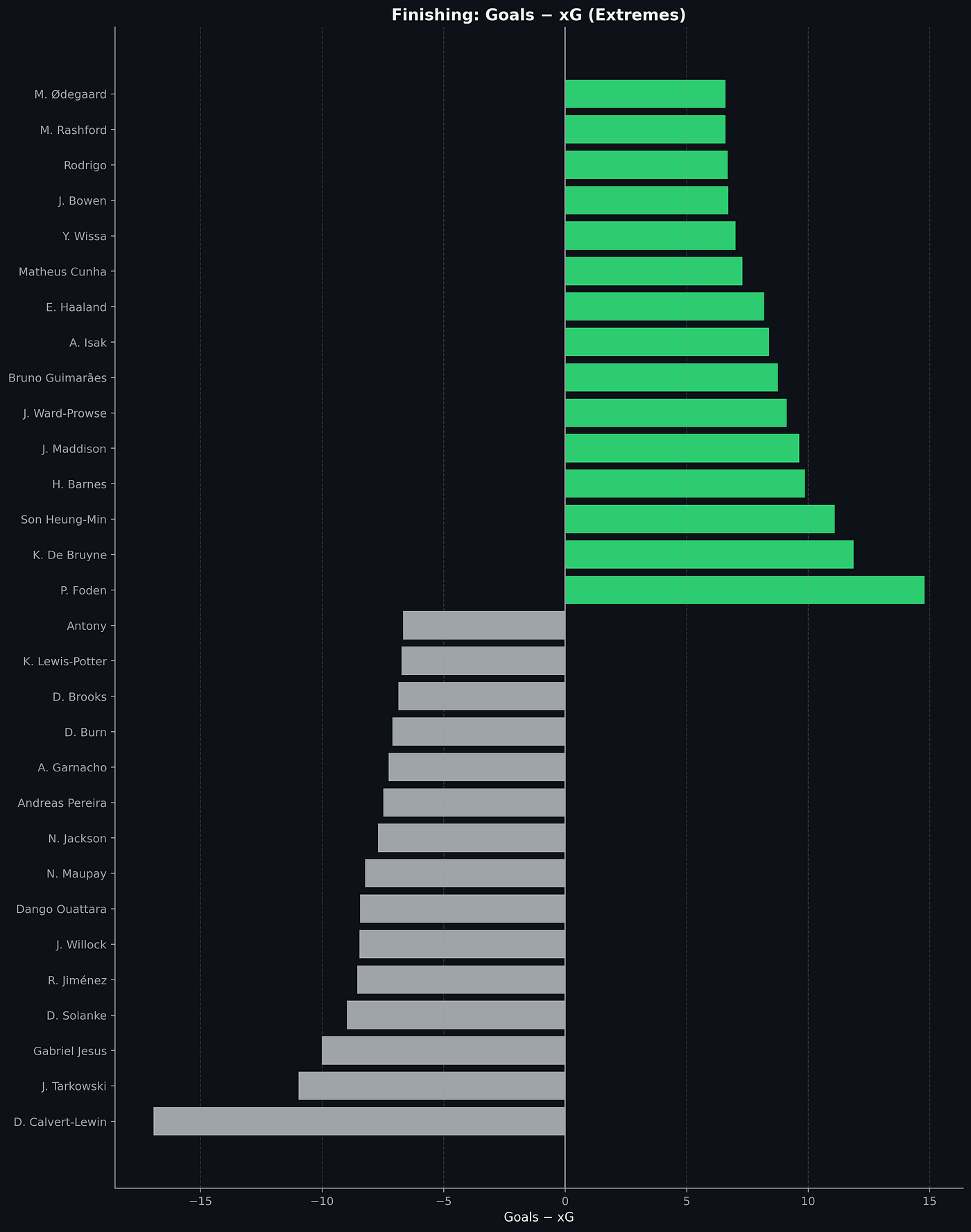 Some players maintain strong adjusted totals because their shot maps remain tightly focused in central box areas with consistent chance types. These players tend to profile as classic penalty-area strikers or system-driven finishers, whose opportunities arise from repeatable attacking patterns.