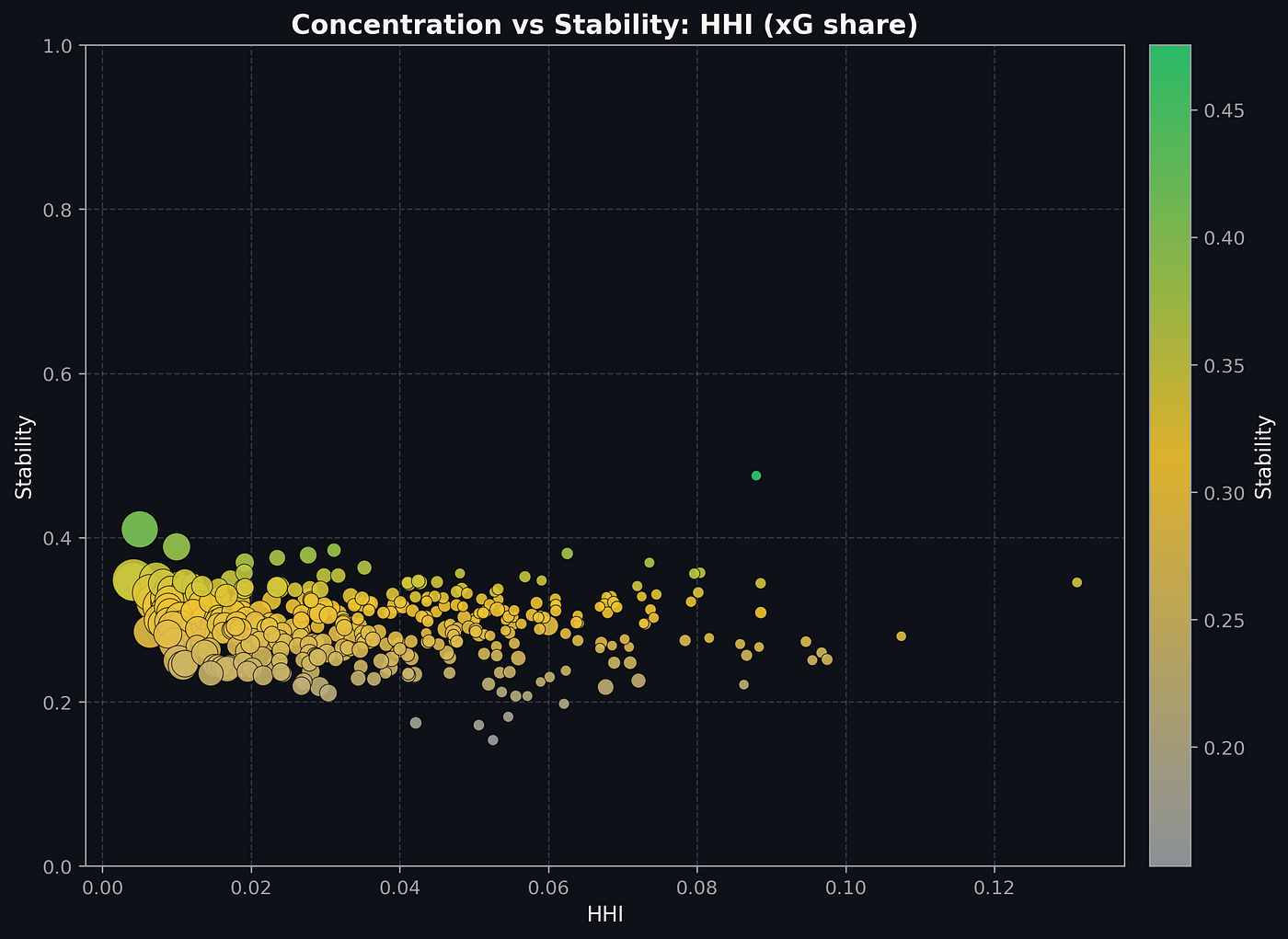 For this reason, stability should not be interpreted as a pure measure of player ability. Instead, it captures how a player’s opportunities emerge within a tactical context. When used in scouting, the metric is most informative when paired with an understanding of team style and expected role in a new system.