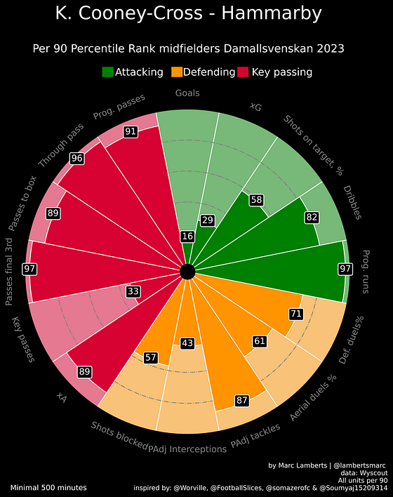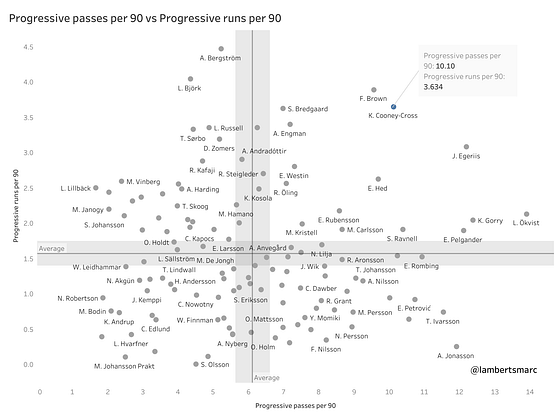 Cooney-Cross has 10,10 progressive passes per 90 and 3,63 progressive runs per 90 in the 2023 Damallsvenskan. This is an indication of her doing very well in relation to her peers.