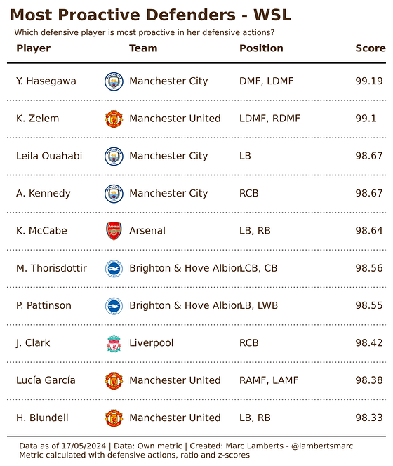 In the table above you can see an example of how we can look for the most proactive player in the WSL. We are looking for the scores closest to 100 and by doing so we find the top 10 of players who are the most proactive in their defence.