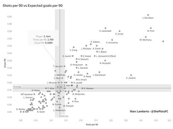 In the shot volume, we can see that Kerr has 1,7 shots per 90 and a shot on target % of 40,91%. This means that she scored above average in both metrics. Not the best, but still slightly above average.