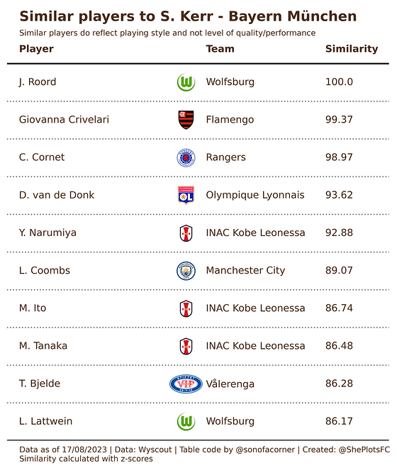 When we look at similar players in teams or playing styles, we get the players above that are similar to Kerr. As she is going to the German Bundesliga and to play for Bayern, it’s interesting that she is quite similar in playing style to Lattwein and Roord. If used properly, we might see another significant attacking player in the Frauen-Bundesliga.
