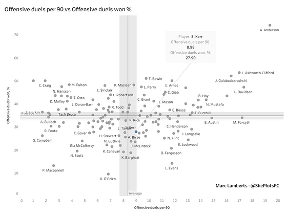 As you can see here, there are more than average offensive duels per 90 by Kerr with 8,98 offensive duels per 90. But on the success rate, she does score below average with 27,90% of her duels won. This gives us the idea that she is more and more inclined to the shooting than in the other areas.