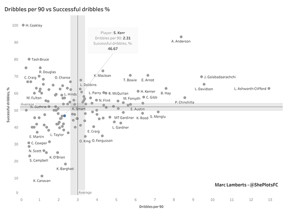 When looking at Kerr’s dribbles per 90, she underperforms in relation to the average with 2,31 dribbles per 90 minutes. And, her success rate is also below average at 46,67%. This means that she isn’t among the best when compared to her peers. In fact she is below average.