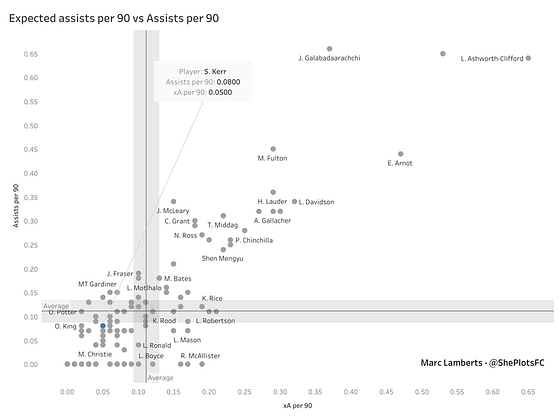 Sam Kerr scores under average in both metrics. She has 0,08 expected assists per 90 and 0,05 assists per 90. This means that she is underperforming on her expected assists with -0,03.