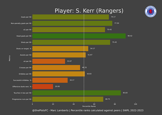 Samantha Kerr — not to be mistaken for Kerr from Chelsea- has signed for Bayern München. That’s a really interesting and good signing in my opinion, but there is not a lot known about Samantha Kerr, who plays as an attacking and central midfielder. In this data scouting report, we will use data to look at how well she has performed in the 2022–2023 season in SWPL in Scotland, with her club Rangers.