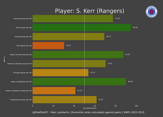 In the visual above you can see the key passes in percentile ranks of Kerr in the 2022–2023 season compared to her peers. What you can see is that she does really well in second assists, third assists, passes to final third and deeply completions.