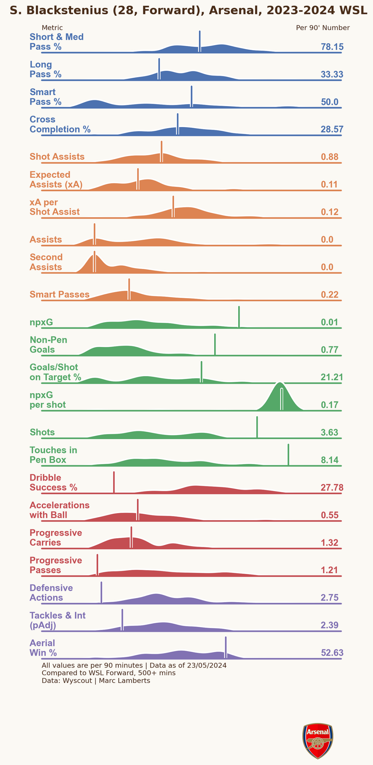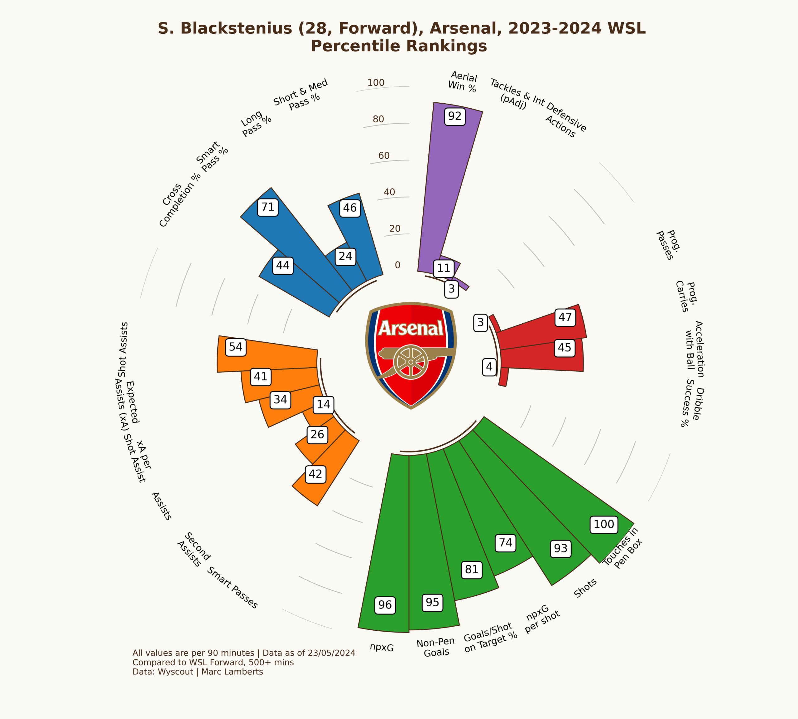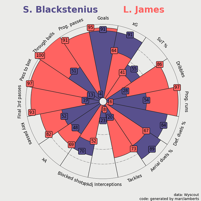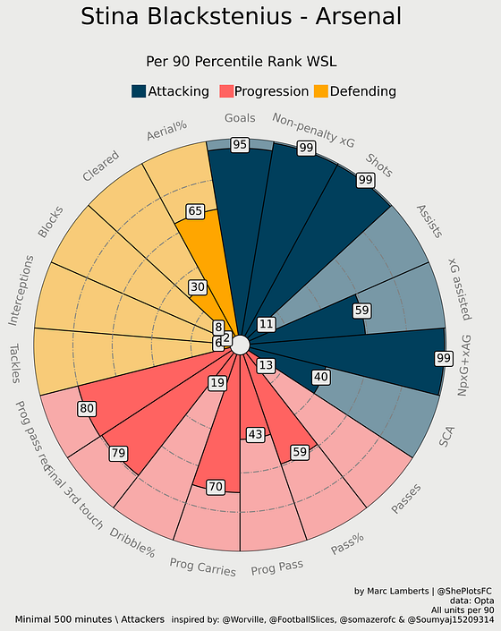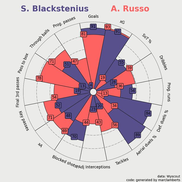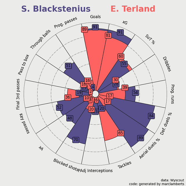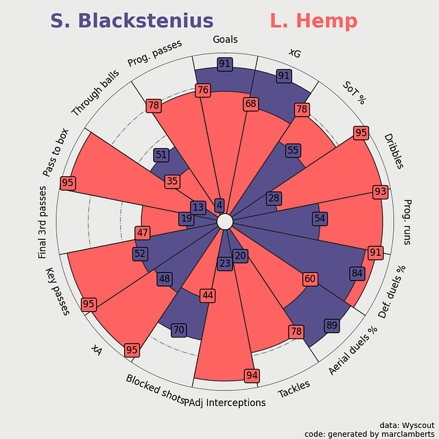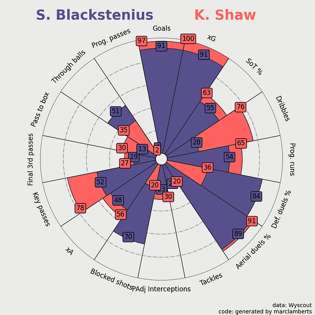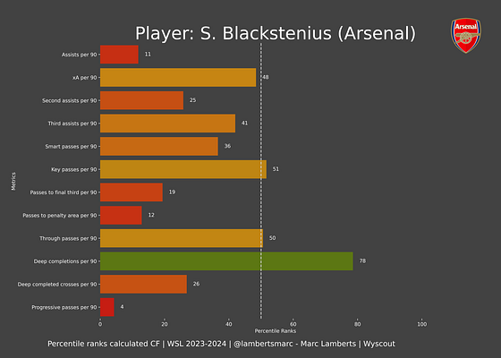 Here you can see the more complete radar percentile ranks on the left, as you can see Blackstenius scores very differently in the different aspects, but in general, we can conclude: that she scores very high in the shooting metrics in green, is great in aerial duels, but scores quite average on anything else.