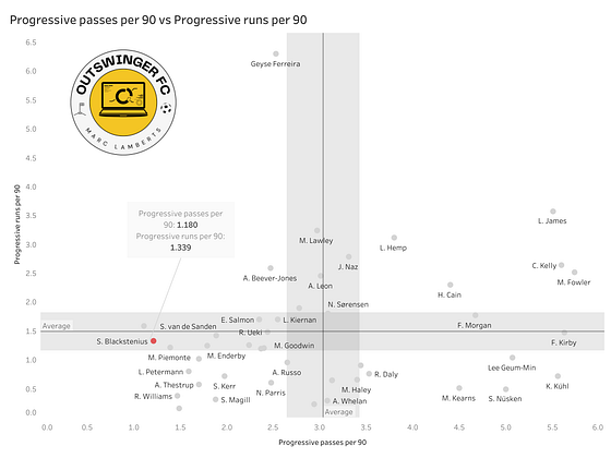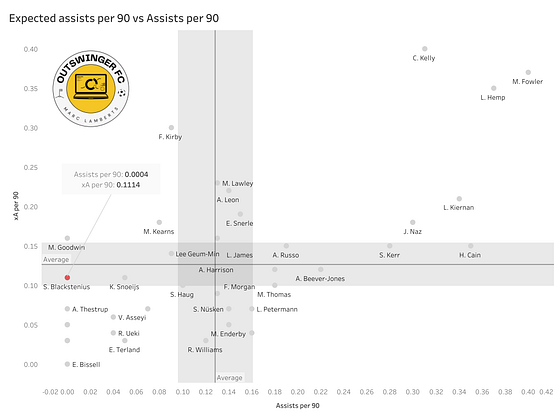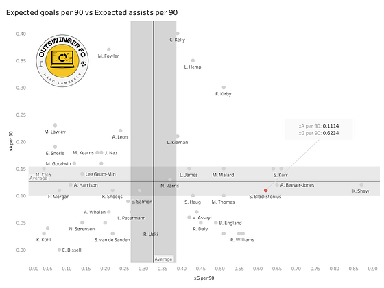 In the scatterplot above you can see the metrics of shots per 90 and expected goals per 90 combined. As you can Blackstenius scores above average for both metrics, with only Beever-Jones, James, Kelly and Shaw scoring better in the volume of shots and the xG generated, only Kerr, Russo, Beever-Jones and Shaw perform better.