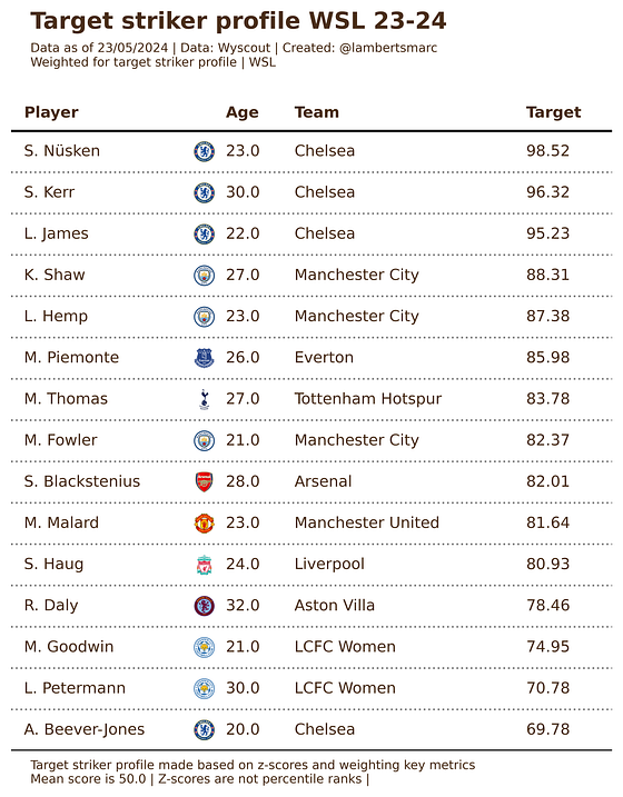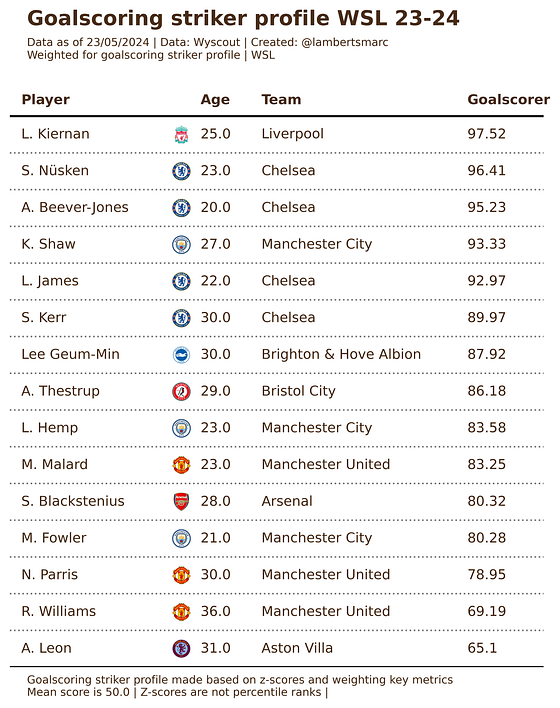 Here we took the data and put emphasis and weight on the key metrics for both roles. What’s interesting is that Blackstenius is in the top 15 of the target striker role according to z-scores, but for the goalscoring role — for what we mainly praise her — according to the data she has a score of 82,01 — which is means she closer to being a perfect fit to the role rather than to the mean score..
