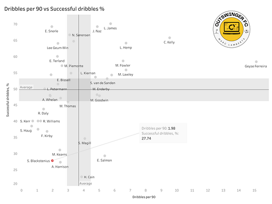 As you can see in the example above, Blackstenius struggles with the ball on her feet in relation to dribbling. Her close control isn’t as good that the defenders can be lost to her advantage. In fact, the defenders have the advantage over her and therefore her success rate is also significantly lower than some of her peers.
