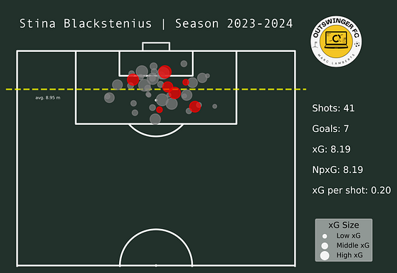 In the shot map above you can see from where Blackstenius has conducted her shots in the 2023/2024 WSL season. She had 41 shots of which 7went in goal. 34,1% of her shots were on target and she generated a total xG of 8,19 — the latter meaning that she is overperforming with +1,19.