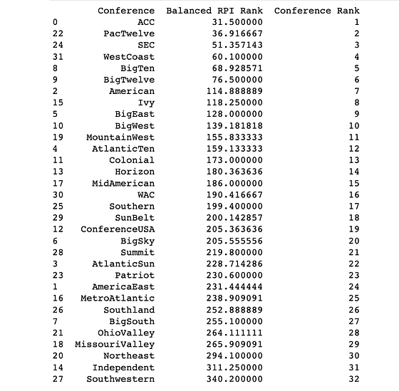 Not only can you see which are the 10 best schools — we can also see which Conferences and regions are represented high up the power ranking. This gives us an idea of which teams/colleges are doing very well on the team-level and might give a good idea of where to recruitment from regarding level.
