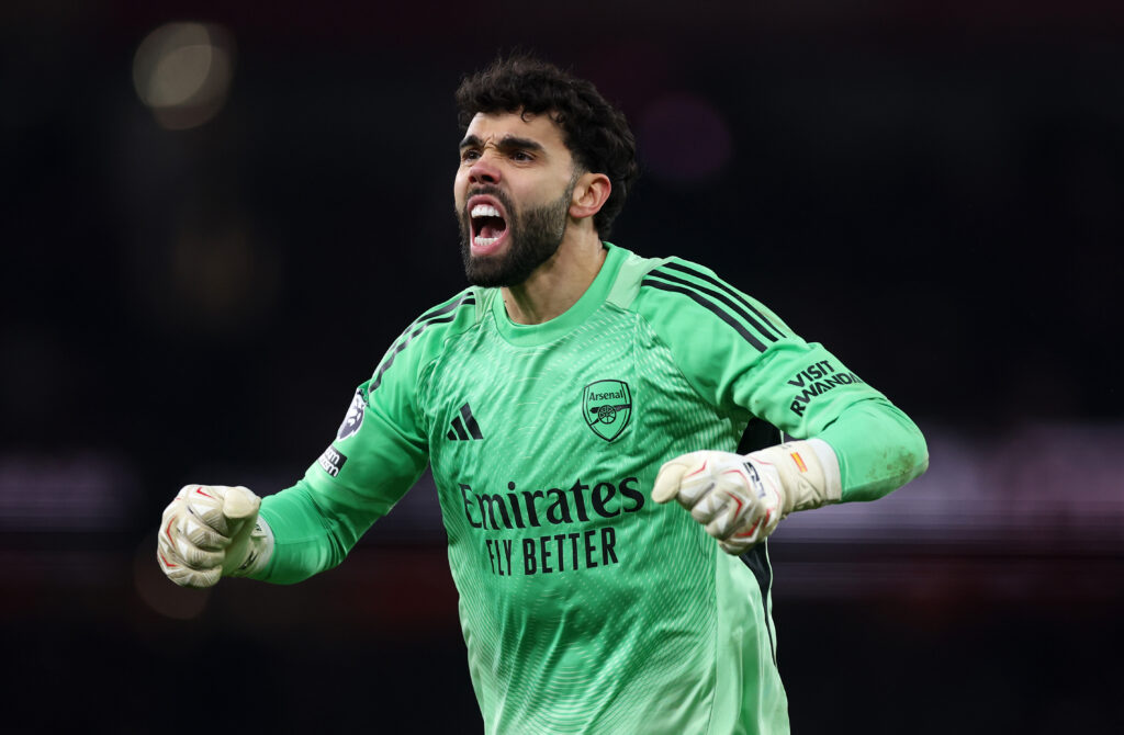 LONDON, ENGLAND – DECEMBER 30: Goalkeeper David Raya of Arsenal celebrates during the Premier League match between Arsenal and Aston Villa at Emirates Stadium on December 30, 2025 in London, England. (Photo by Julian Finney/Getty Images)