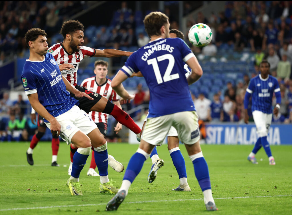 CARDIFF, WALES – AUGUST 26: Lee Angol of Cheltenham Town shoots from the rebound after his penalty kick was saved by Matthew Turner of Cardiff City (not pictured) during the Carabao Cup Second Round match between Cardiff City and Cheltenham Town at Cardiff City Stadium on August 26, 2025 in Cardiff, Wales. (Photo by Dan Istitene/Getty Images)