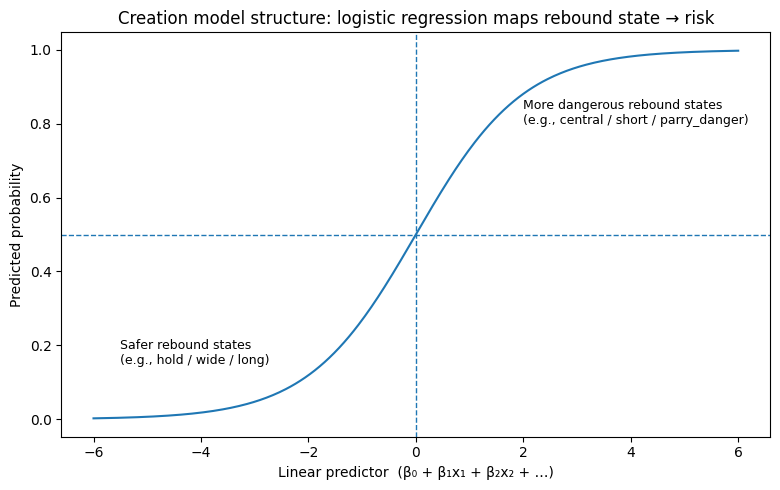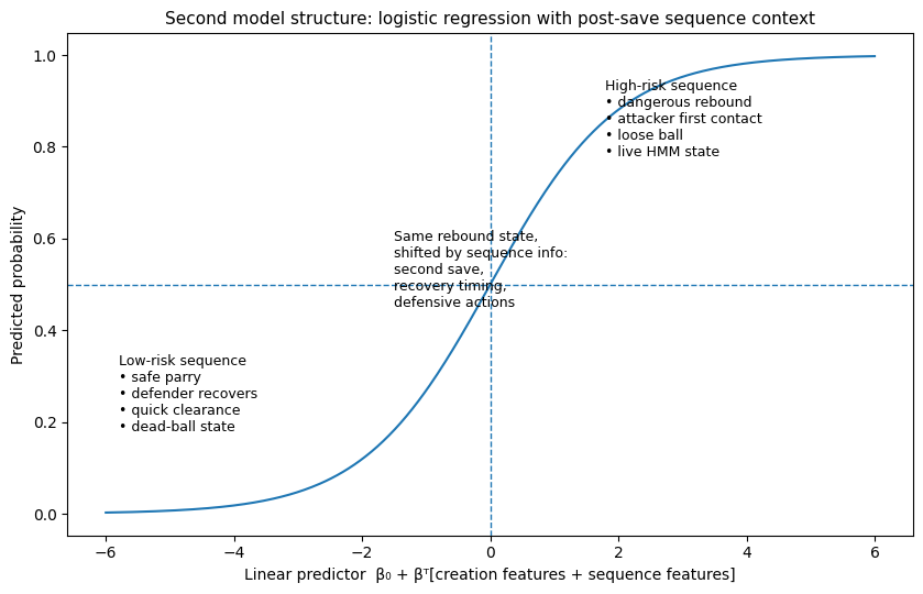 And you know what? This is not a singular model; these are two different models. Both models were estimated using regularised logistic regression, which predicts the probability of a binary outcome as a smooth function of input features via the logistic link. Logistic regression is well suited to this setting because it produces calibrated probability estimates rather than arbitrary scores, allowing expected post-save risk to be interpreted directly and aggregated across episodes. An elastic-net penalty combining L1 and L2 regularisation was applied during estimation. The L1 component encourages sparsity by shrinking weak or redundant coefficients to zero, effectively performing feature selection in the presence of highly correlated predictors such as rebound geometry, danger flags, and recovery indicators. The L2 component stabilises coefficient estimates by shrinking large weights, reducing variance and preventing overfitting, which is particularly important given the rarity of post-save goals. Together, this combination yields models that are interpretable, robust to multicollinearity, and well calibrated out of sample.