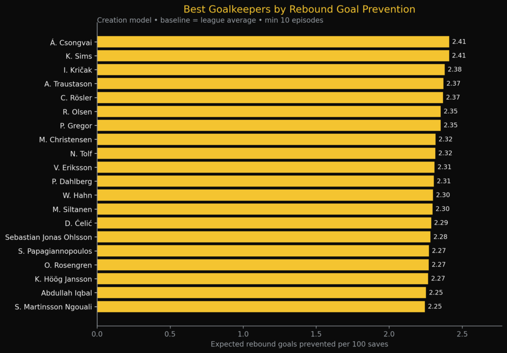 In this bargraph, you see the best goalkeepers per goal prevention from rebounds. It measures the Expected rebound goals prevented per 100 saves in the Allsvenskan. A. Csongvai does perform best in the expected metrics with 2,41 expected rebound goals prevented.