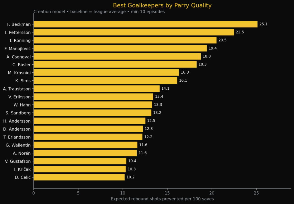 Beckman does really well, as he only seems to concede 14,76 rebounds shots per 100 saves. Pettersson and Rönning follow closely.