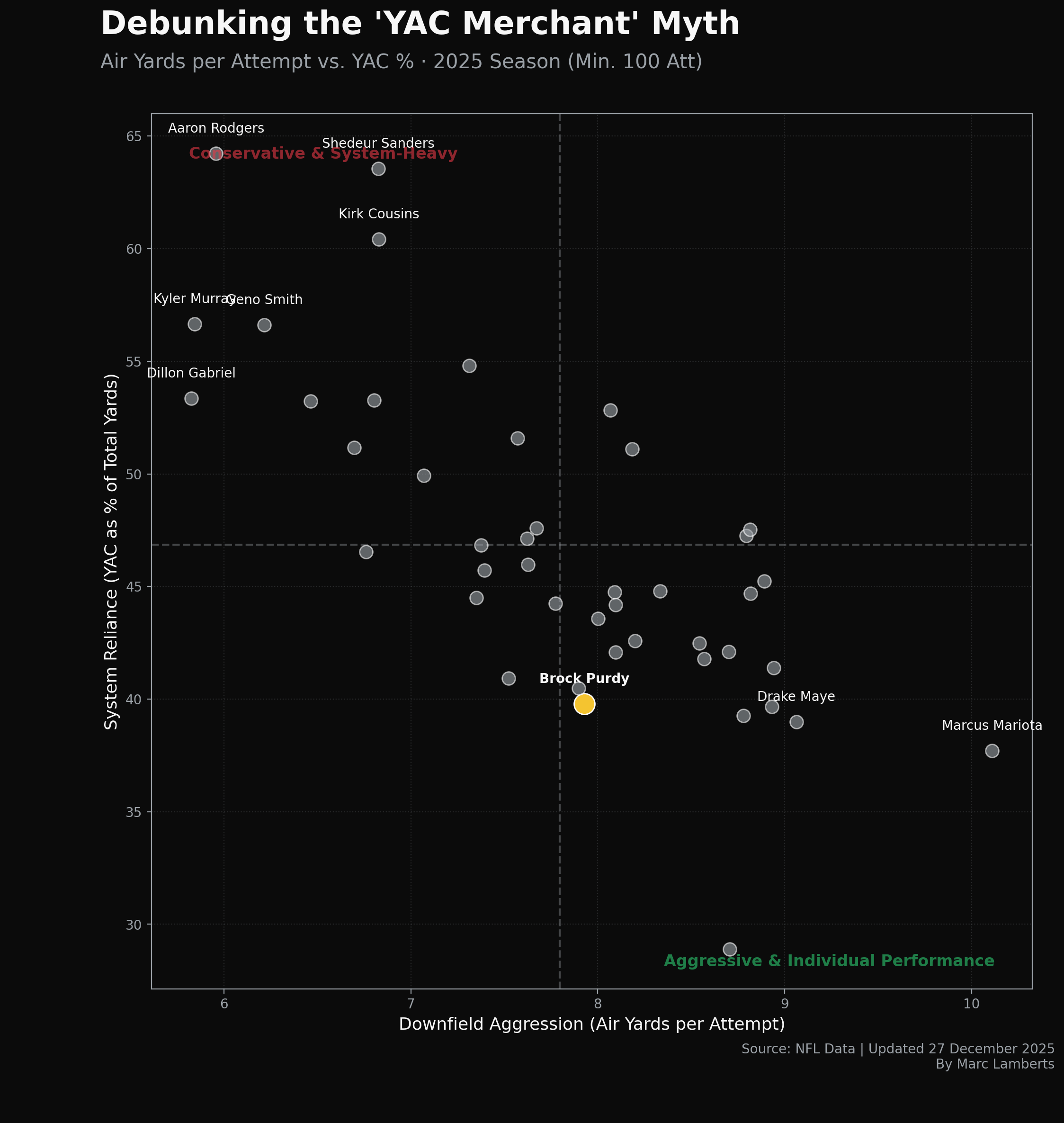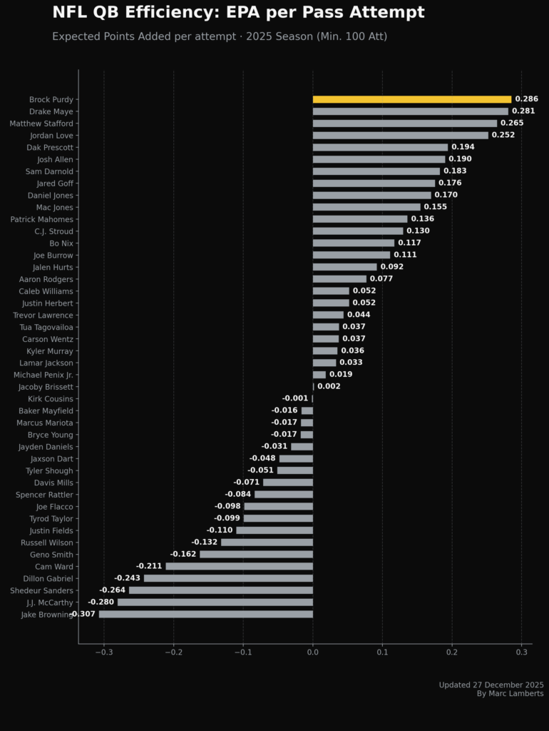 The 2025 data tells a clear story: Brock Purdy isn’t just riding the wave of a great system; he’s the one creating it. Leading the league with an EPA per attempt of 0.286 and a massive +8.7 CPOE, his success is evident in his elite ball placement and processing, rather than relying solely on safe check-downs or a dominant run game. In fact, with a sack rate near the bottom of the league and a reliance on YAC that’s actually lower than most of his peers, it’s hard to argue he’s anything but a top-tier individual talent. The data proves Purdy is a high-level processor who thrives on the exact high-pressure, high-difficulty throws that separate good quarterbacks from truly great ones.