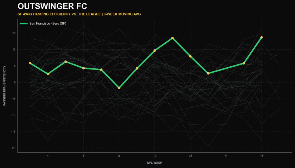 What we can see in the graph above, is how the passing EPA has been throughout the season so far. What’s interresting is that 49ers had a drop after MD11, but are now climbing again in terms of passing EPA after MD15. Really getting better,
