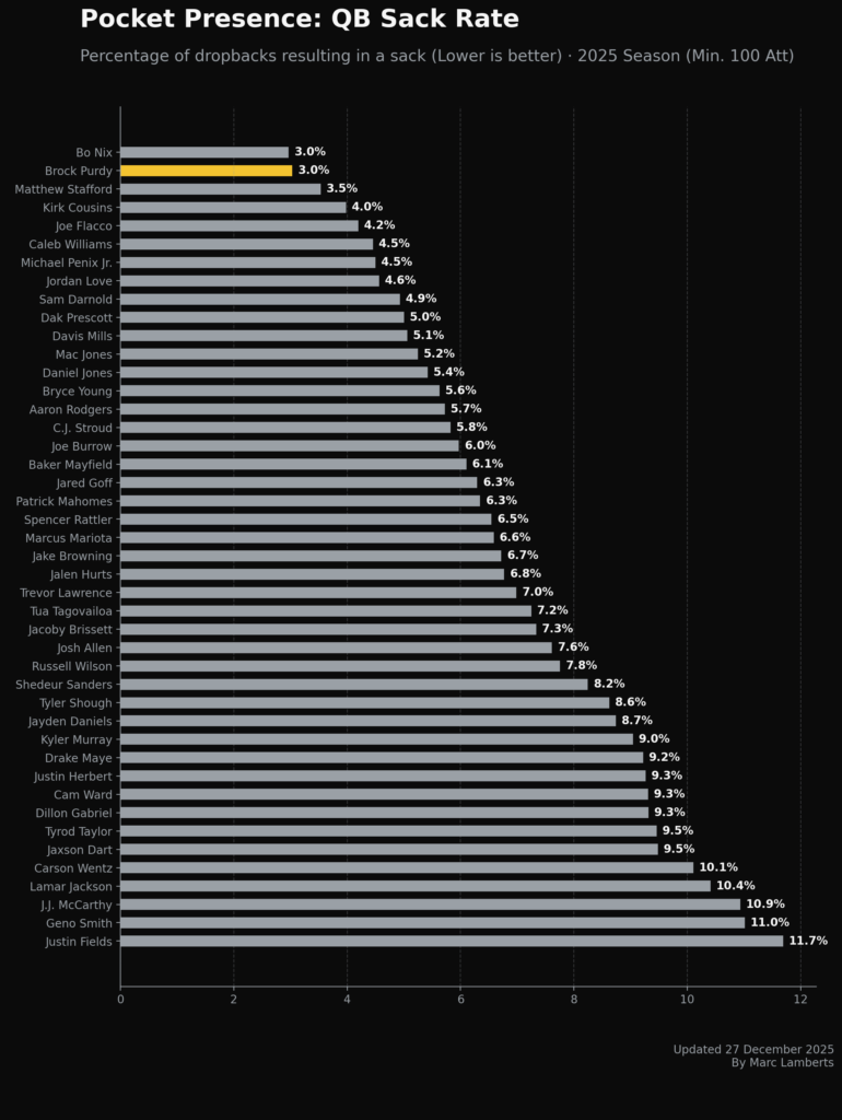 The data reveals that Brock Purdy possesses elite pocket presence, evidenced by a remarkably low sack rate of just 3% in the 2025 season. While critics often attribute a clean pocket to a team’s offensive line or scheme, a quarterback’s ability to avoid sacks is widely considered an individual skill related to processing speed and internal timing. With only 7 sacks suffered over the recorded period, Purdy ranks among the best in the league at preventing negative plays, significantly outperforming many of his peers who see sack rates climb into the double digits.